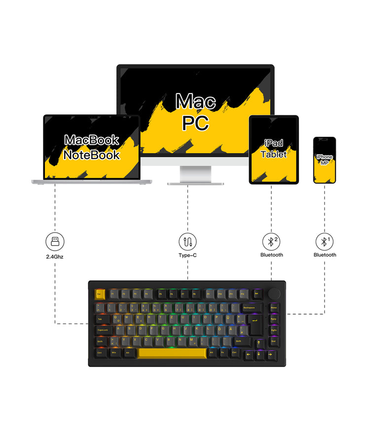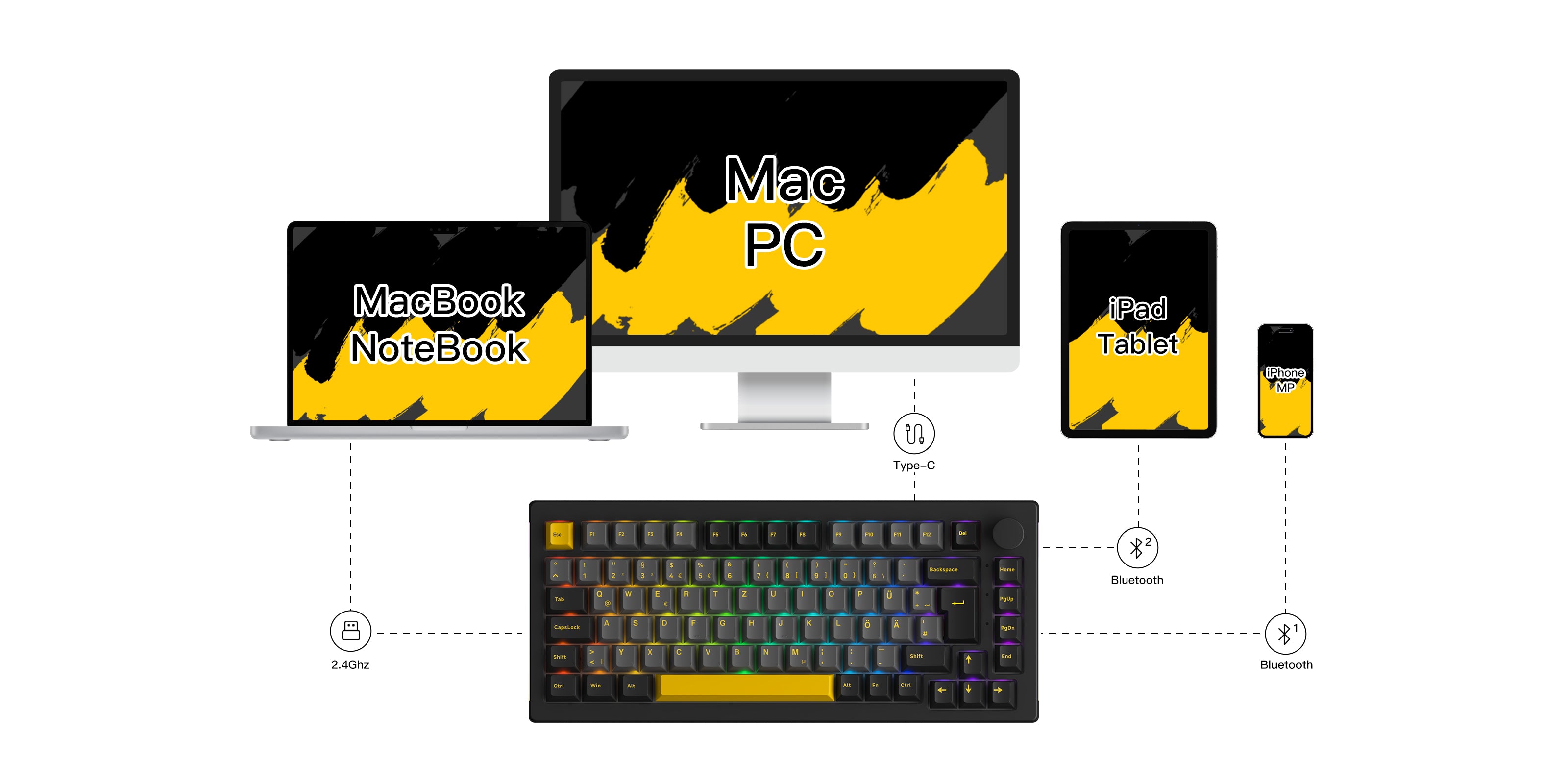 ISO layout + RGB LED backlight + Hot-swappable + Bluetooth 5.0 + 2.4G Wireless + Wired (USB-C Mode) All in One!