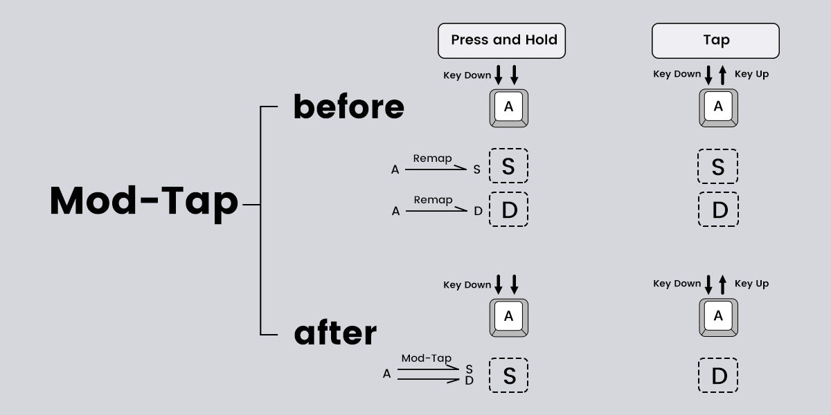 Mod-Tap is a design that provides convenience for gaming. It allows the creation of dedicated or dual-function keys based on key press behavior.