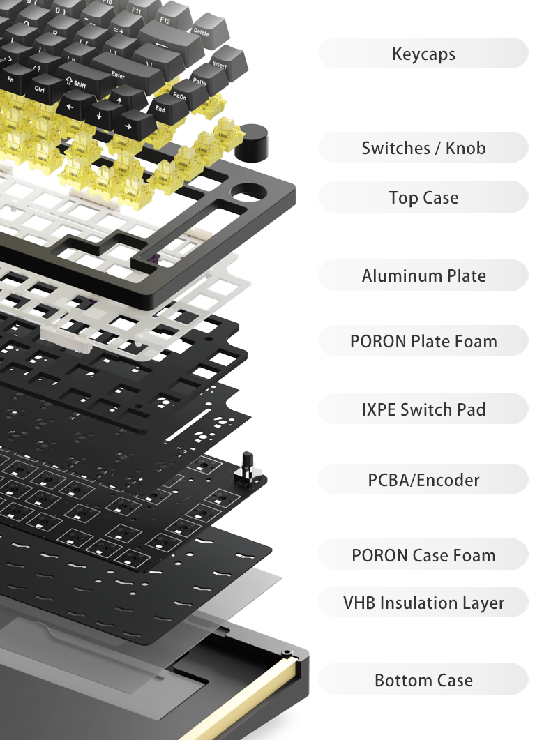 The pre-assembled M1 HE keyboard is equipped with PORON plate foam, which effectively reduces the noise generated by the key switches and ensures a purer and more pleasant sound experience for the keyboard.