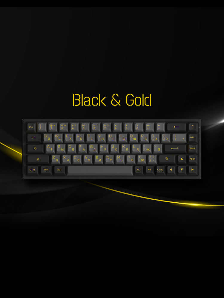 Das Black & Gold Cyrillic Tastenkappen Set (68-Tasten) passt ausgezeichnet zu den beliebten 65% Layouts.