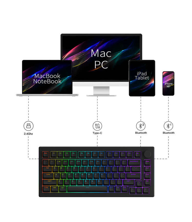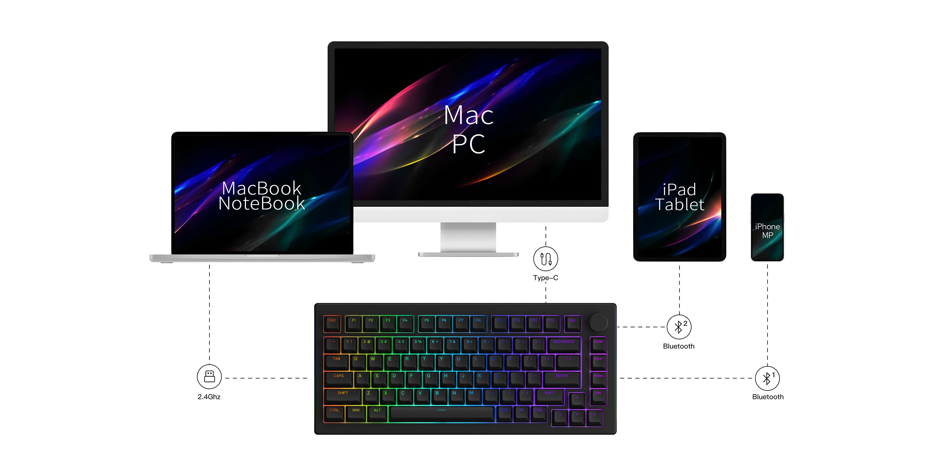RGB-LED-Hintergrundbeleuchtung + Hot-Swap-fähig + Bluetooth 5.0 + 2.4G Wireless + Wired (USB-C Mode) All in One!