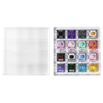 The 16-piece switch tester set allows me to understand the behavior of some switch models. It ships in a solid, clear plastic case which easily fits in my pocket. It is a definite improvement over the Cherry MX tester set, which includes only 10 switches, yet is almost 4 times bigger in size — and made entirely out of cardboard (but uses the inside of the box cover flap to list model names and mention main parameters such as behavior (clicky/tactile/linear/silent), registration and travel length).