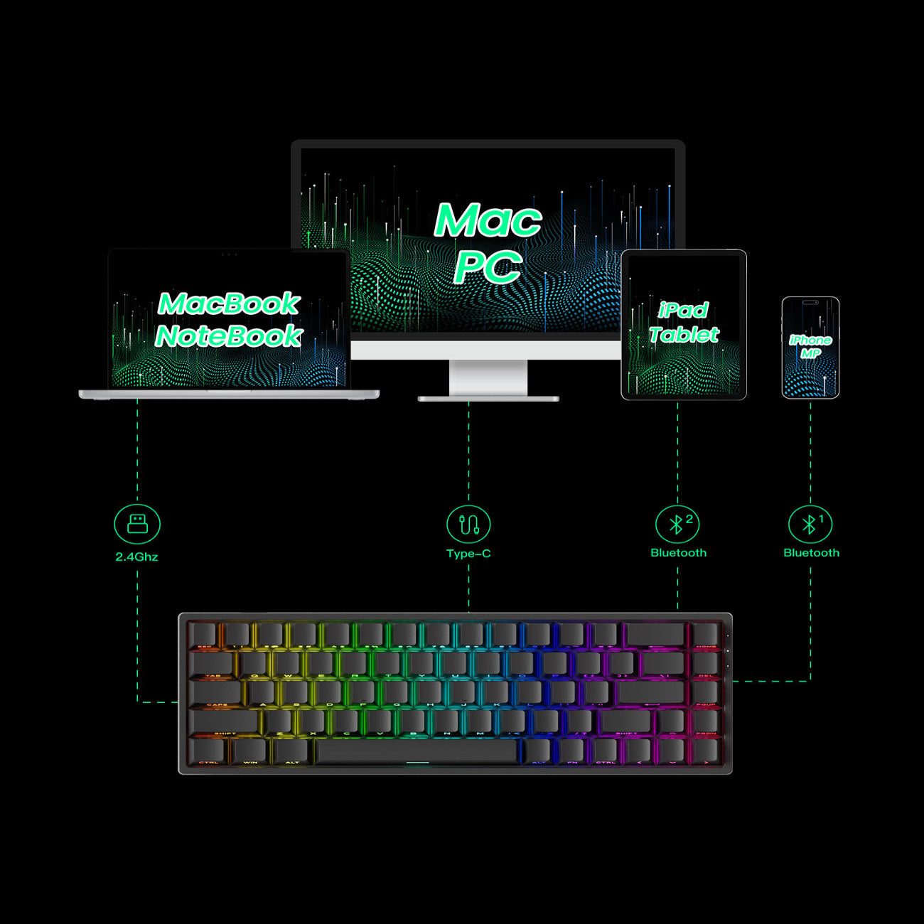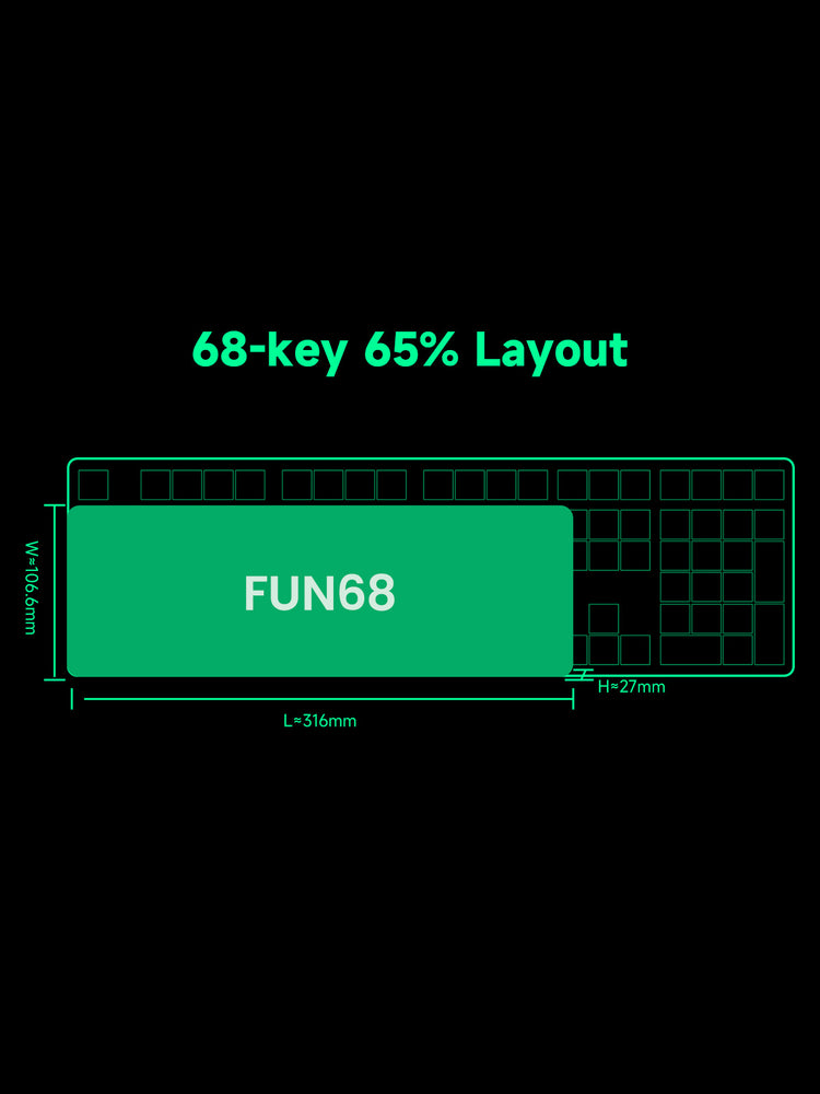 Die FUN68 Wireless Serie verfügt über ein 65%-Layout und ist mit einem integrierten 3000mAh-Akku ausgestattet. Sie ermöglicht langanhaltendes, unterbrechungsfreies Tippen, Gaming oder produktives Arbeiten – ganz ohne häufiges Aufladen.