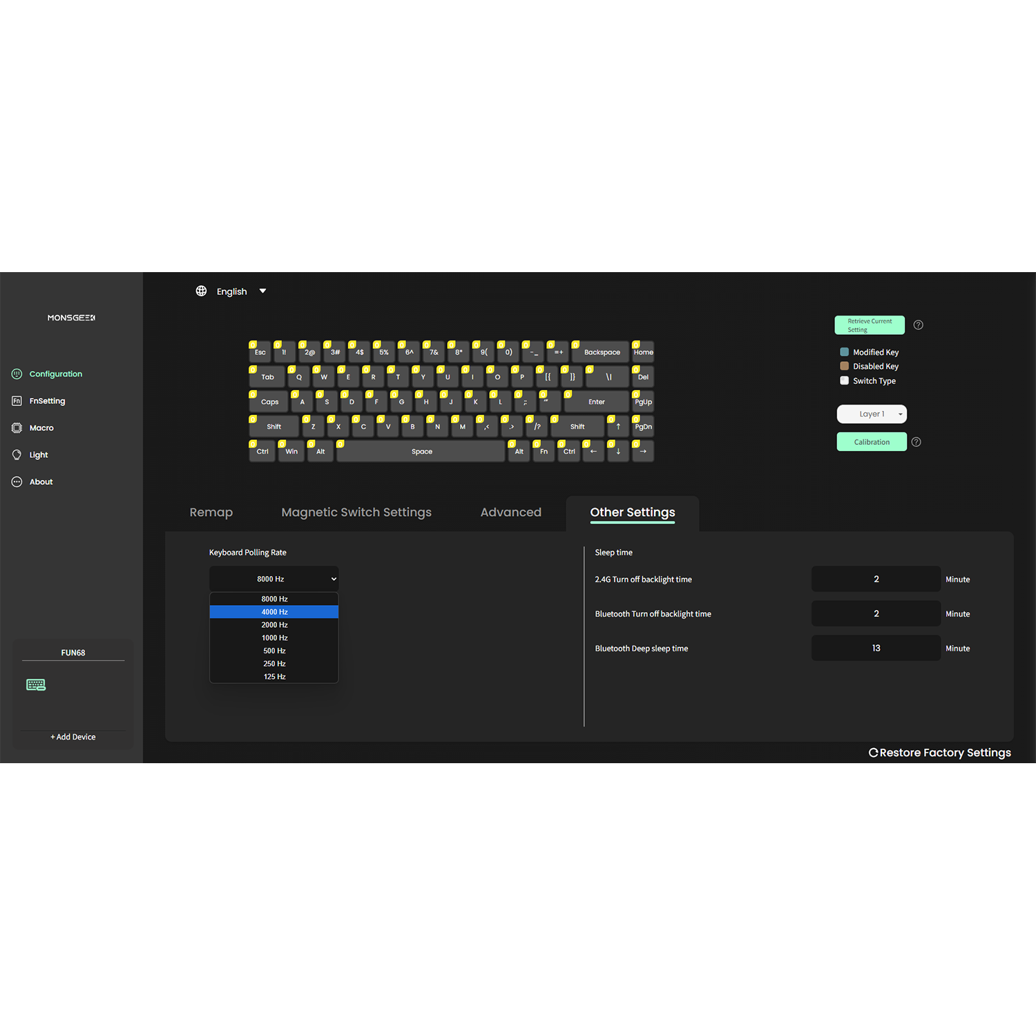 Die FUN68 Wireless Version (Tri-Mode) unterstützt eine 8.000 Hz Polling-Rate für alle Tasten im kabelgebundenen sowie im 2,4G-Wireless-Modus.