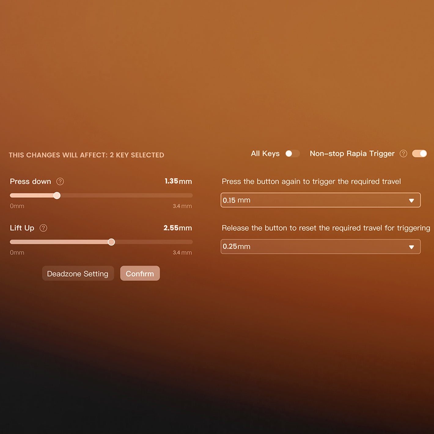 Rapid Trigger ändert dynamisch die Betätigungs- und Deaktivierungspunkte der Tasten. Über den Akko-Treiber können Benutzer die Modi „Alle Tasten“ oder „Pro Taste“ auswählen und „Nonstop Rapid Trigger“ für eine nahezu sofortige Tastenreaktion aktivieren. Dies verschafft FPS-Spielern einen Wettbewerbsvorteil bei rasantem Gameplay.
