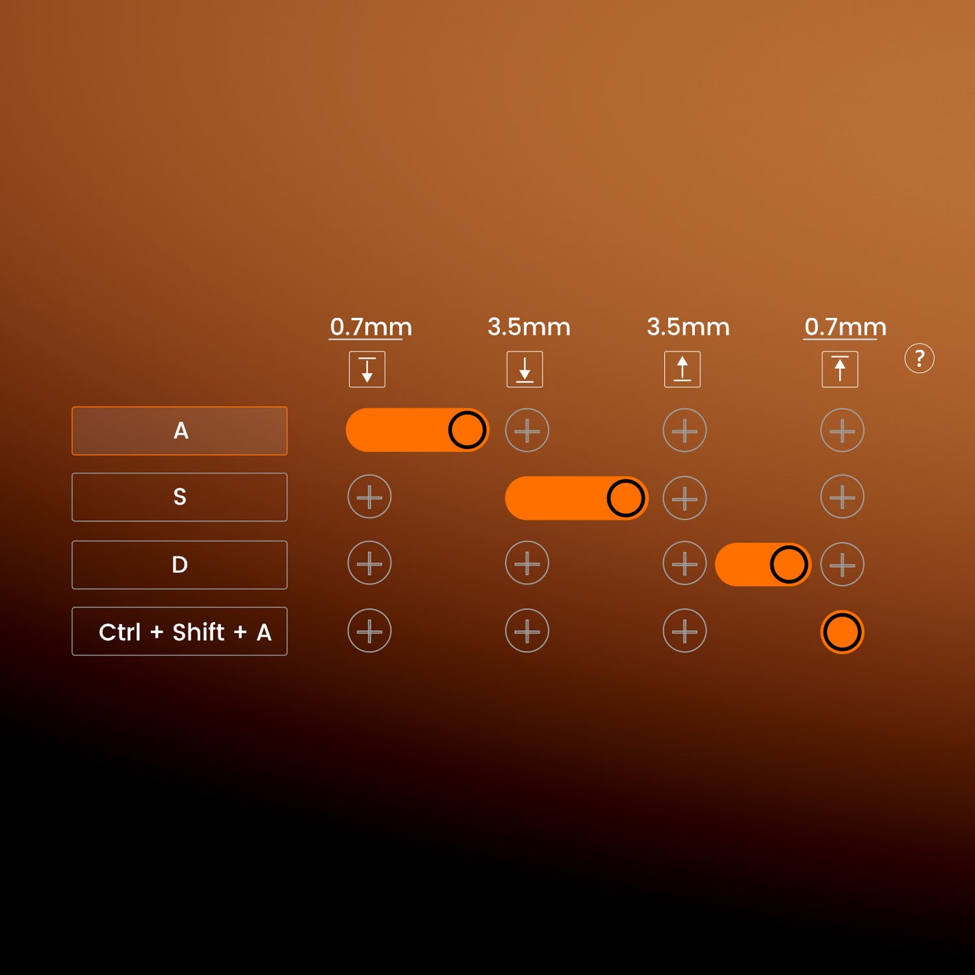 Ultrapräziser 0,005-mm-Schnellauslöser und einstellbarer Betätigungsabstand in 0,005-mm-Schritten. Benutzer können ihr Tipp- oder Spielerlebnis für schnellere Reaktionszeiten und verbesserte Genauigkeit anpassen - perfekt für wettbewerbsorientierte Spiele.