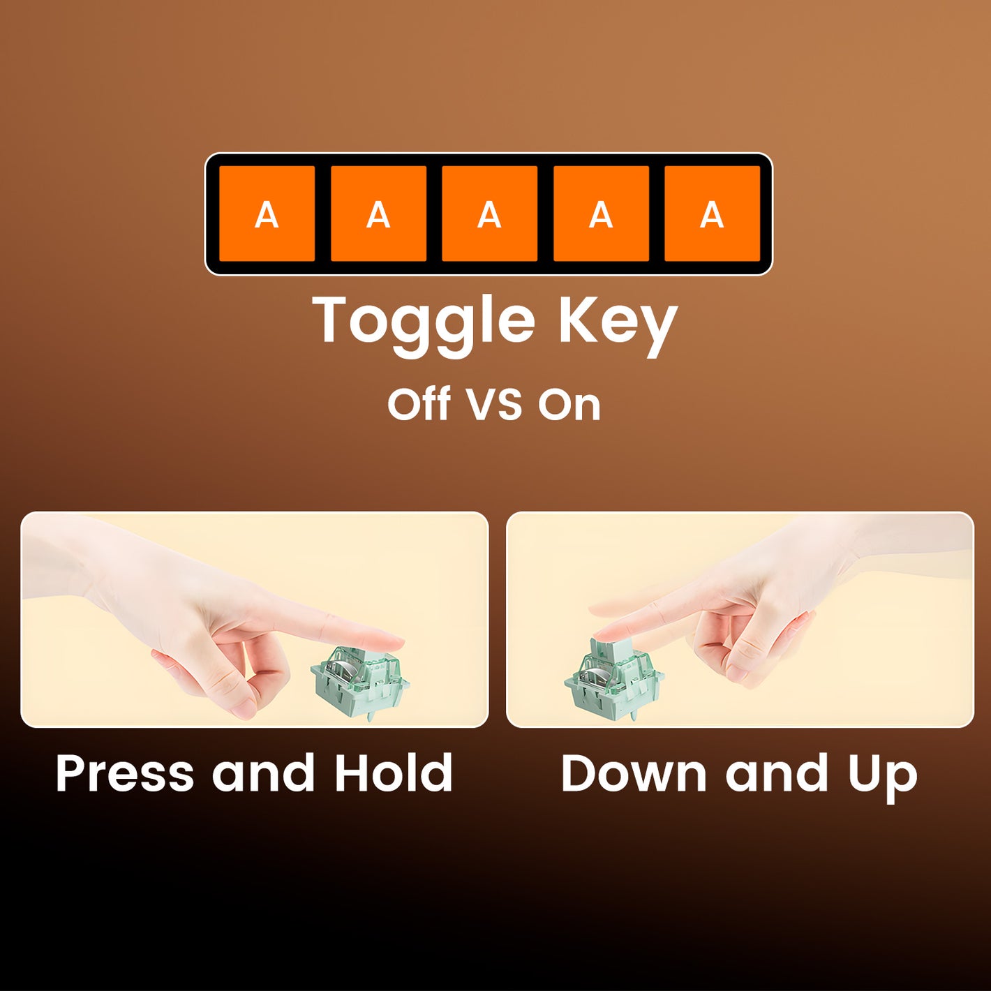 TGL, oder Toggle Key, verwandelt eine Taste in einen Kippschalter. Wenn Sie diesen Schalter drücken, können Sie eines von zwei Szenarien aktivieren: Entweder halten Sie die Taste/Funktion kontinuierlich gedrückt oder Sie lösen die Taste/Funktion mehrmals mit hoher Frequenz aus.