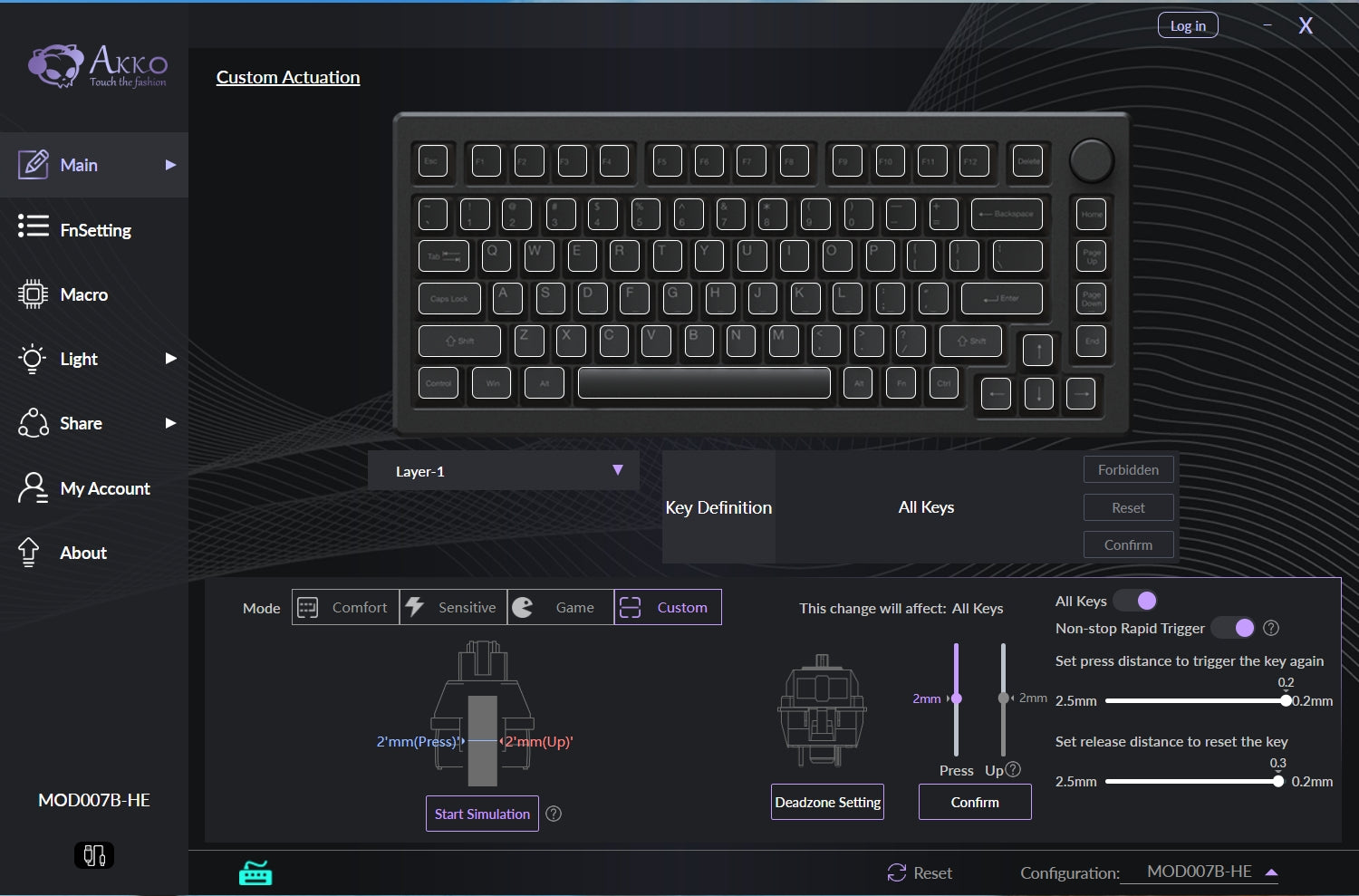 Rapid Trigger ändert dynamisch die Betätigungs- und Deaktivierungspunkte der Tasten. Über den MonsGeek-Treiber können Benutzer die Modi "Alle Tasten" oder "Pro Taste" auswählen sowie "Nonstop Rapid Trigger" für eine nahezu sofortige Tastenreaktion aktivieren. Dies verschafft FPS-Spielern einen Wettbewerbsvorteil bei rasantem Gameplay.