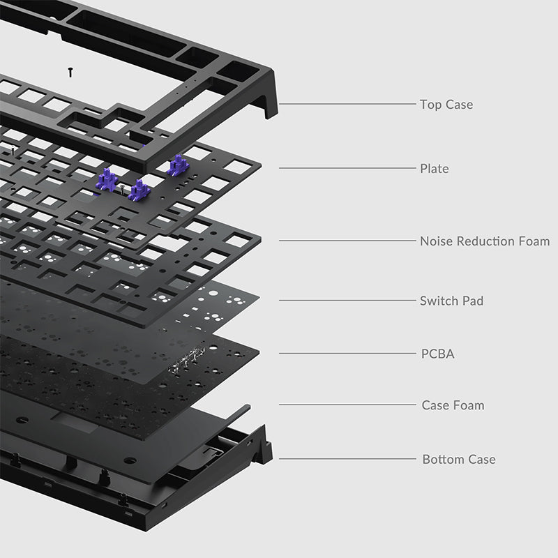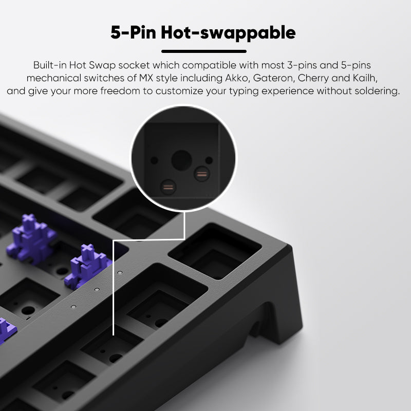 With hot-swappable sockets, the Monsgeek MG75 keyboard allows you to easily complete your Keyboard. The kit supports both 3-pin and 5-pin switches, making it compatible with most mechanical switches in the market. No need for any kind of soldering, simply connect or replace your switches on the MG75 Kit.