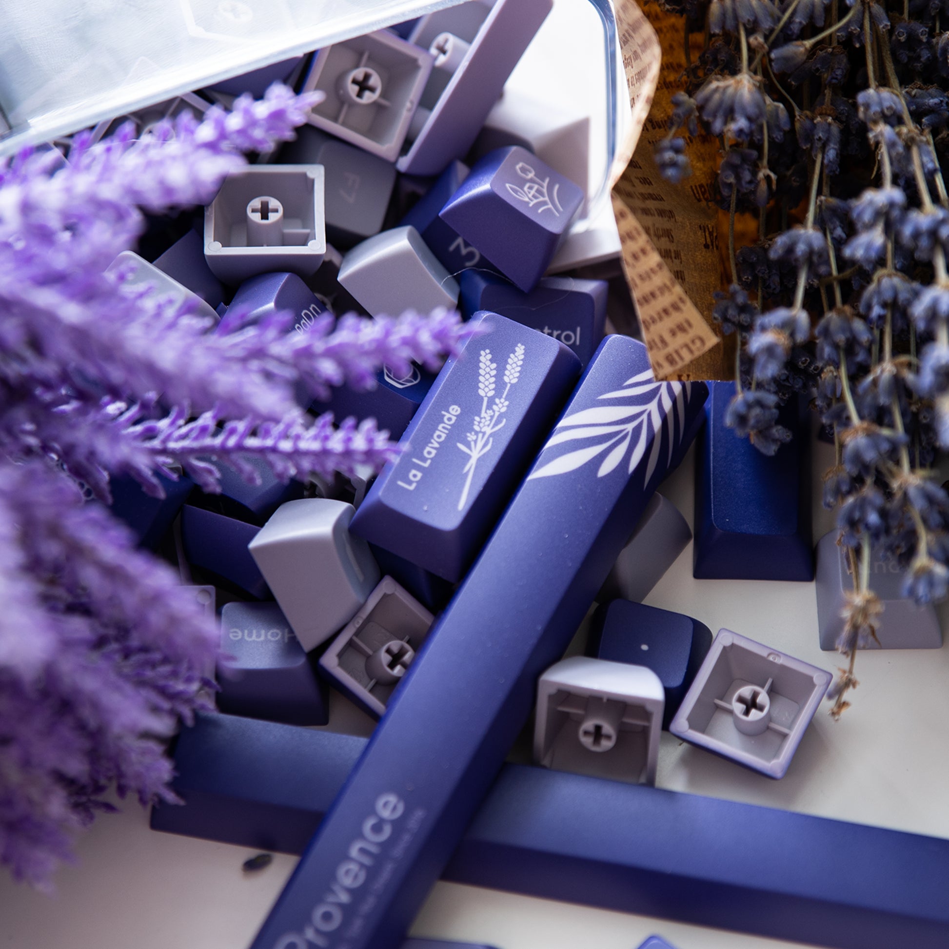 The keycap set is featuring the Lavender bloom in Provence (France) with a purple theme in a gradient fashion.