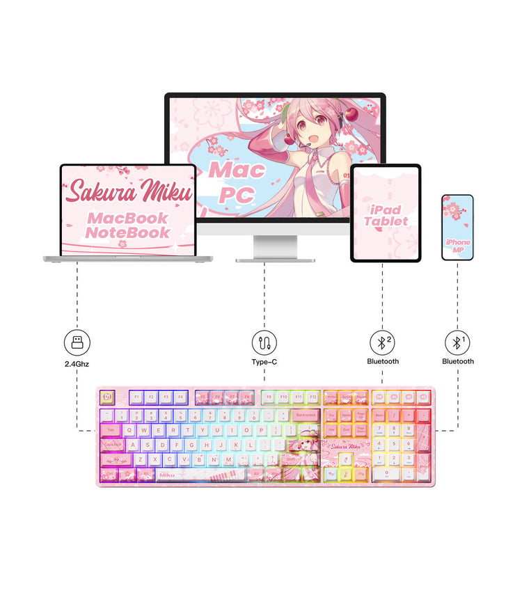 Die rosa Tastatur Sakura Miku 5108B Plus bietet den Komfort von kabelgebundenen (USB-C), kabellosen 2,4G- und Bluetooth 5.0-Verbindungen in einem Gerät. Wechseln Sie ganz einfach zwischen Geräten und Modi für ein bequemes und anpassbares Benutzererlebnis.